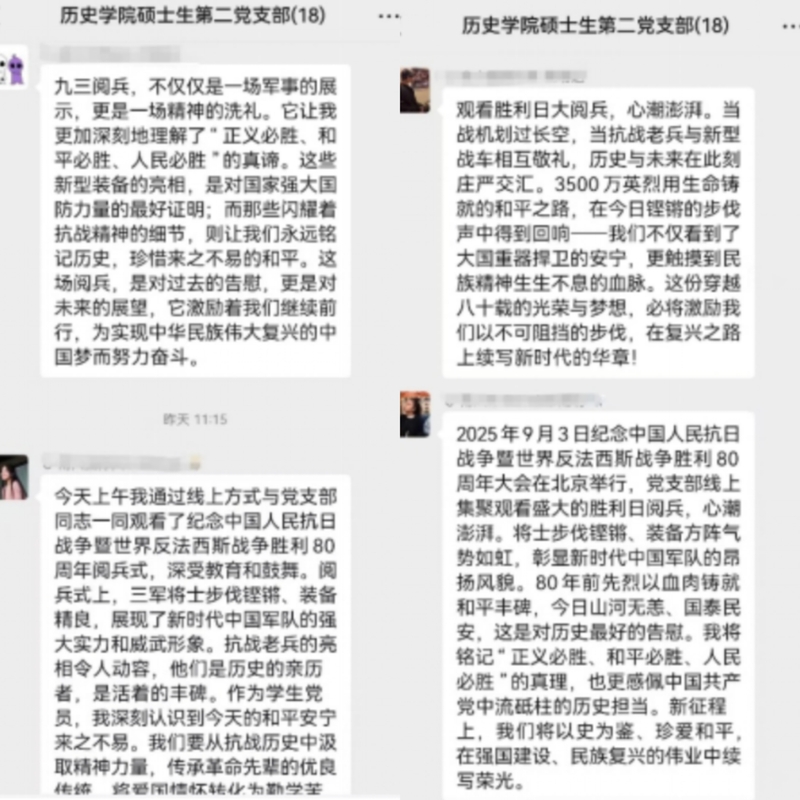 2025年9月3日9时,纪念中国人民抗日战争暨世界反法西斯战争胜利80周年大会隆重举行。pg电子试玩 硕士生第二党支部全体成员通过腾讯会议的方式线上集体收看直播。在工位、在教室、在宿舍、在图书馆,虽然硕士生第二党支部的同学们或因实习事务、或因学业繁忙而难以齐聚一堂,共享一方物理空间。但在网络的连接中,大家共同沉浸于这一场气势恢宏、意义深远的爱国主义教育盛宴,感受着炽热而深沉的家国情怀。