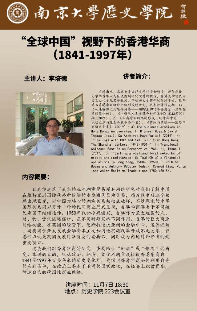 讲座预告 | “全球中国”视野下的香港华商(1841-1997年)
